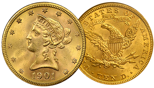 Diversify beyond modern gold bullion like American Eagles into large, 100-year-old gold coins which offer greater profit potential due to their fixed and limited supply. Liberty coins were made from the mid-1800’s until 1907 and the $10 denomination was the half-ounce (.48375-oz.) piece during this period.