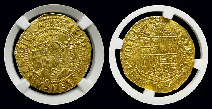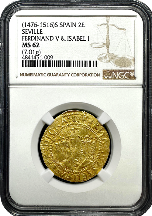 The 1476-1516 Spain 2 Escudo from the Seville Mint, struck during the reign of Ferdinand V and Isabella I, is a stunning gold coin from one of the most pivotal periods in Spanish history. Certified Mint State-62 by NGC, this piece offers a remarkable glimpse into the wealth, power, and legacy of Spain’s most influential monarchs.
