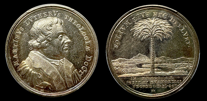 Reverse: The reverse depicts a palm tree beside a river in a desert, symbolizing resilience and spiritual endurance. The Latin inscription "FOLIVM EIVS NEC DEELVET," meaning "Its leaf shall not wither," references Psalm 1:3, emphasizing unwavering faith. This imagery reflects the steadfast growth of the Protestant faith over two centuries.