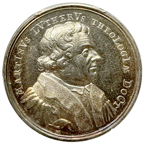 The 1717 Silver Silver Medal from Nuremberg commemorates the 200th anniversary of Martin Luther's initiation of the Protestant Reformation in 1517. This medal celebrates the enduring impact of Luther's actions, which led to significant religious transformations across Europe. Amazingly, this shiny silver proof is the only one ever certified by PCGS!