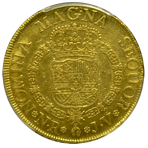 Introducing the 1762-NR JV Colombia 8 Escudo, a magnificent historical treasure certified by PCGS in AU-53. This large gold coin was issued around 250 years ago and is literally one of only FIVE examples known in all grades between PCGS and NGC combined! Coins don't get much rarer than this, and certainly not for this kind of money.