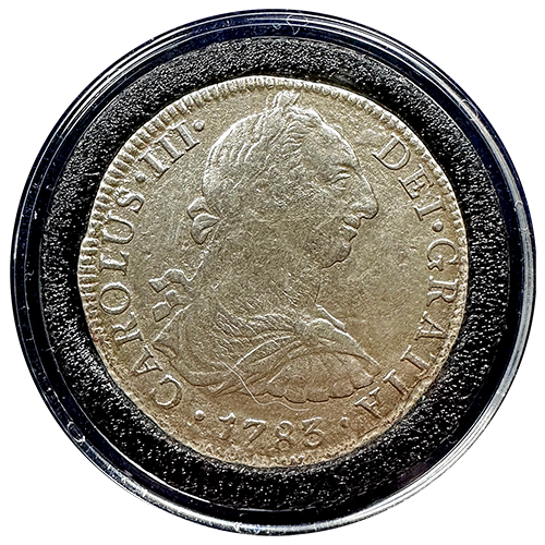 The person depicted on the front of the coin is King Charles III of Spain, also known as Carlos III. The lettering around the edge of the obverse, "D-G-HISPAN-ETIND-REX-1792-CARLOS-III," can be translated as "By the Grace of God, King of the Spains and the Indies, Carlos III, 1792." On the reverse, the lettering "MAGNA-SEQUOR-J.V.-N-R-NOMINA" can be translated as "I follow great names" with "J.V." referring to Joaquín Vásquez, the Assayer of the Mint in Nuevo Reino (present-day Colombia) during that time.