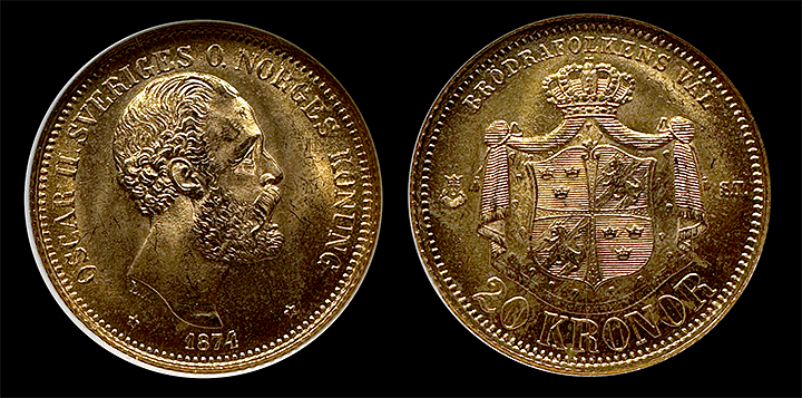The 1874 Sweden 20 Kronor gold coin is an exceptional piece of Scandinavian history and artistry. Certified by NGC in gem Mint State 65 condition, this coin is part of Sweden's most revered gold coin series, struck during the reign of King Oscar II. It holds significant historical value, as it played a central role in establishing the Scandinavian Currency Union in 1873—a groundbreaking gold-backed monetary agreement that brought about four decades of prosperity, stability, and peace in Northern Europe.