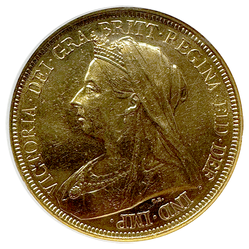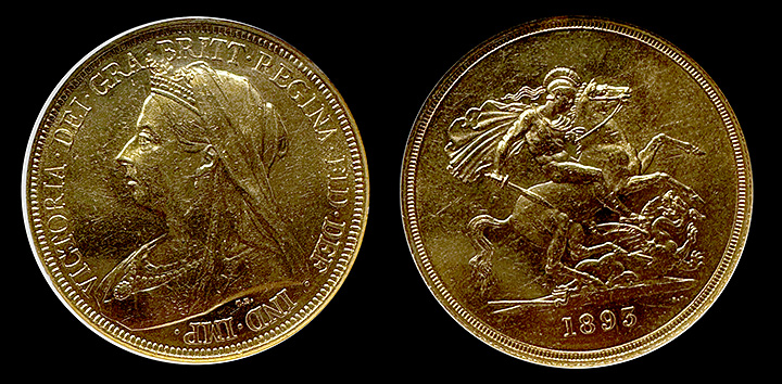 The obverse features the iconic "Veiled Head" portrait of Queen Victoria, designed by Thomas Brock. This design commemorates her later years as Britain’s beloved monarch, wearing a diadem crown and mourning veil. The reverse showcases Benedetto Pistrucci's timeless depiction of St. George slaying the dragon, surrounded by the date "1893," an enduring symbol of courage and triumph. This is a very rare denomination that was issued for circulation for three years only: 1887, 1893 and 1902.