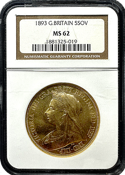 This stunning 1893 Great Britain Gold Quintuple Sovereign is a remarkable example of numismatic history. This is the final year of issue of the coveted "Veiled Head" design on the Quintuple Sovereign and it has been certified by NGC in Mint State 62. The coin is absolutely stunning when held in hand and a coveted treasure for collectors of British and world gold coinage.