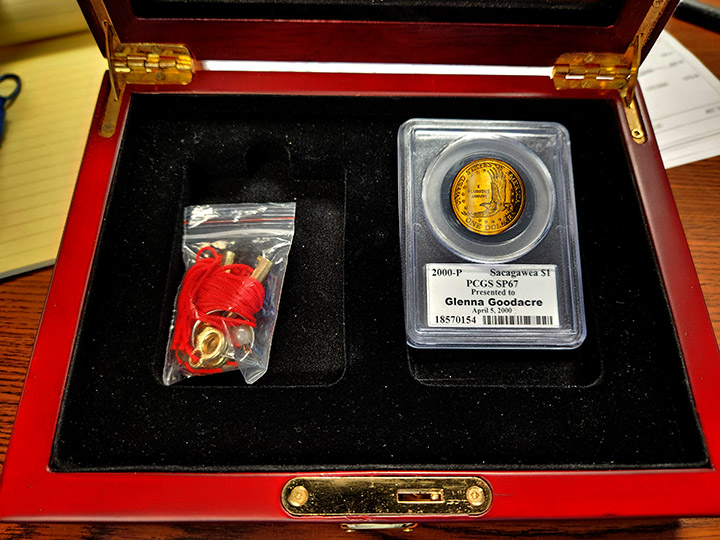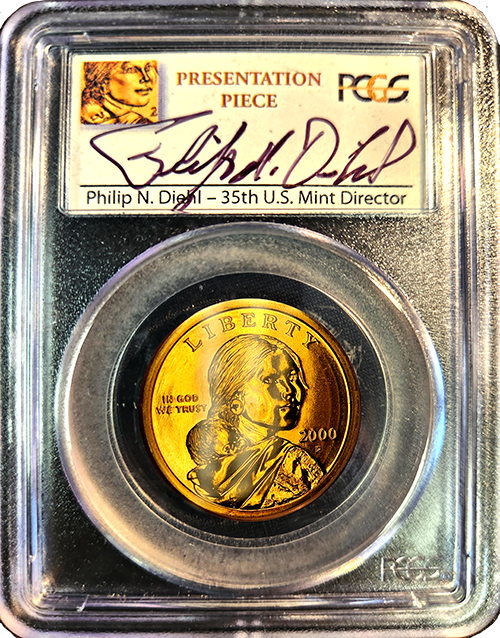 This 2000-P Sacagawea $1 coin is not only a stunning example of U.S. minting but also a piece of numismatic history with a unique provenance. Certified by PCGS in SP67 condition, this coin was part of a special presentation made to Glenna Goodacre, the artist who designed the obverse of the Sacagawea dollar. It was presented to her on April 5, 2000, as a tribute to her contribution to American coinage and as her commission for the project, 5000 of these special coins were produced and given to her as payment.
