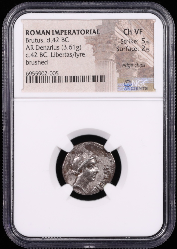 42 BC Marcus Junius Brutus Silver Denarius NGC Choice Very Fine