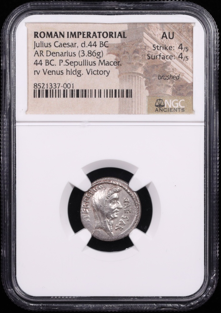 44 BC Julius Caesar Dictator Perpetuo Silver Denarius NGC AU 4x4