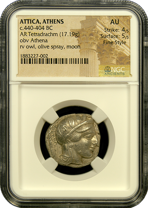 Presenting the Attica, Athens Silver Tetradrachm, a captivating artifact from the classical period of ancient Greece. This coin, minted between 460-440 BC, weighs 17.19 grams and is certified by NGC in Choice About Uncirculated condition. With an impressive Strike rating of 4/5 and a Surface rating of 5/5, this Tetradrachm exhibits fine style and exceptional detail. It is also an earlier issue than most owls offered today, perhaps dating back as far as 460 B.C.