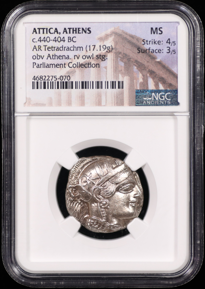 This example, from the prestigious Parliament Collection, is certified by NGC as Mint State with strong strike and surface quality (4/5, 3/5). The coin displays excellent details on both sides and has a fantastic luster.