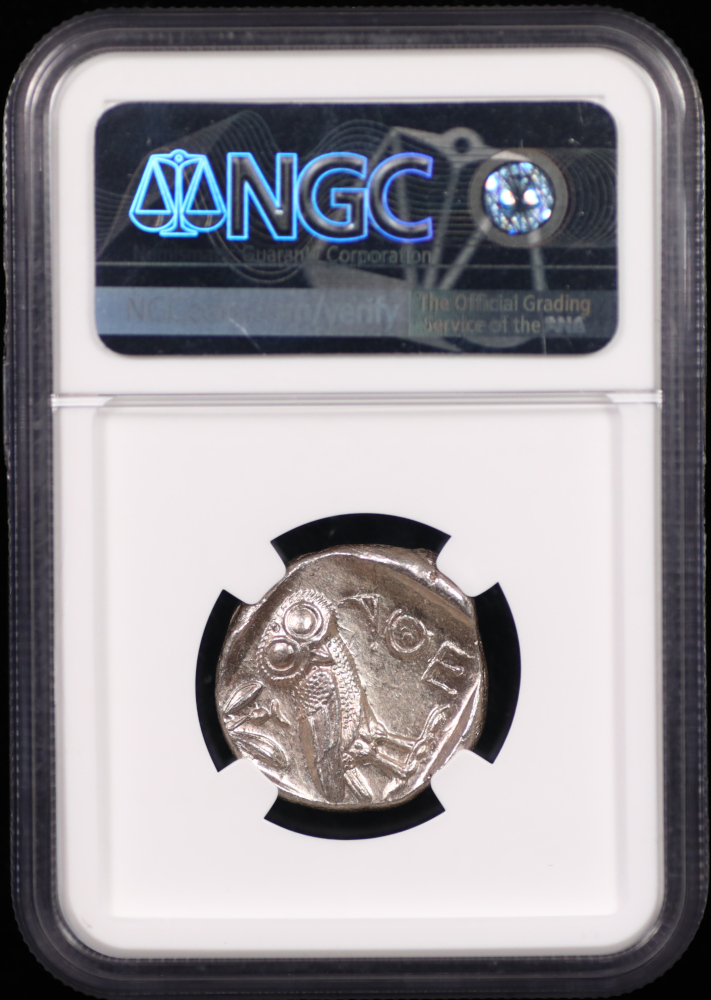 Ranked #10 among the 100 Greatest Ancient Coins, the Owl holds legendary status with collectors. Its obverse depicts Athena, patron goddess of wisdom and warfare, while the reverse shows her sacred owl, standing beside an olive sprig and crescent moon. These images reinforced Athens’ dominance as both a naval and economic superpower.