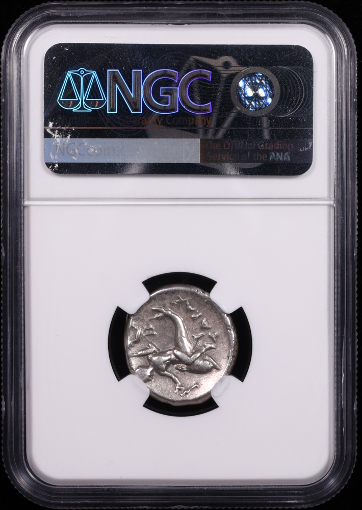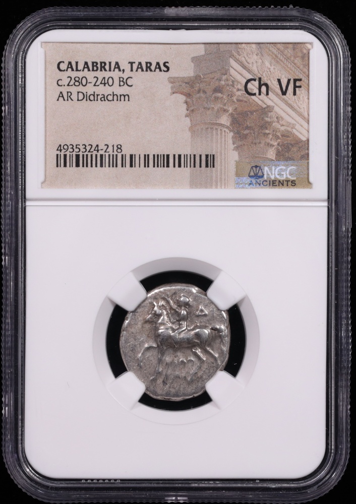 The ancient Greek city of Taras (modern Taranto) in Calabria was one of the most prosperous colonies of Magna Graecia, founded by Spartan settlers in the eighth century BC. This silver didrachm, struck circa 280-240 BC, dates to a turbulent period when Taras sought military alliances — most notably with King Pyrrhus of Epirus — to resist the expanding power of Rome. Certified by NGC Ancients, the coin reflects the distinctive artistry and cultural identity of one of southern Italy's most important mints.