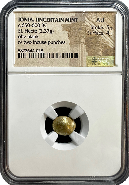 The Ionia Electrum Hecte is a rare and historically significant artifact, representing the early stages of coinage and the innovative spirit of ancient Ionia. The obverse blank and the reverse with two incuse punches make this coin distinctive, illustrating the transition from rudimentary to more sophisticated minting practices. Its certification by NGC assures collectors of its authenticity and excellent condition, enhancing its desirability and value.