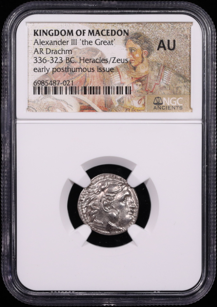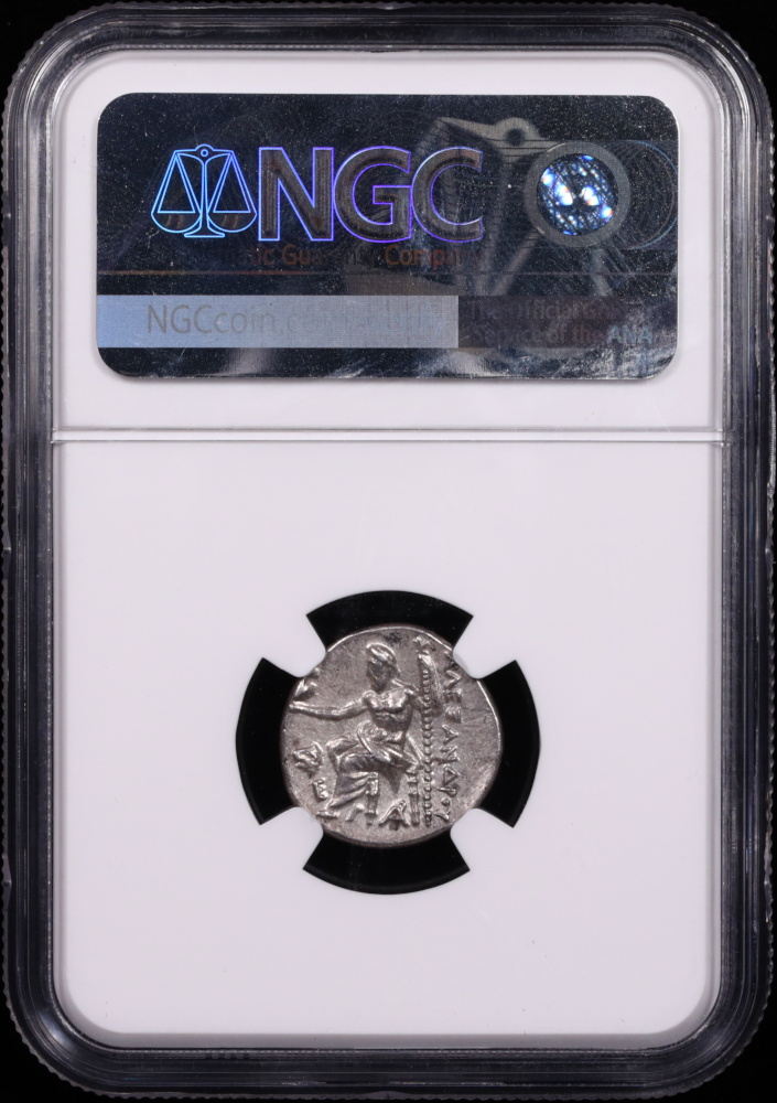 This silver tetradrachm was struck during the lifetime or shortly after the death of Alexander III of Macedon, also known as Alexander the Great, who ruled from 336 to 323 BC. Issued during one of history's most transformative military campaigns, this coin circulated throughout the vast territories conquered by Alexander, from Greece to the edges of India. The tetradrachm served as the standard high-value silver denomination across the Hellenistic world, facilitating trade and tribute in an empire that redefined political and economic boundaries. This piece has been certified AU (About Uncirculated) by NGC Ancients with a strike rating of 5/5 and a surface rating of 4/5, reflecting its well-preserved state.