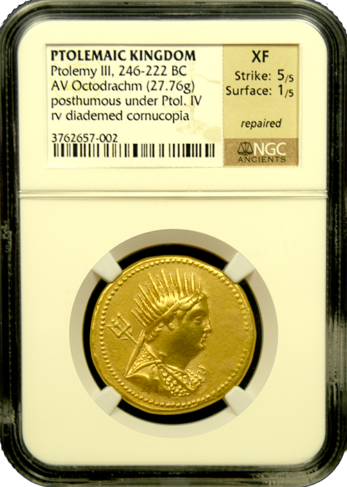 The Ptolemaic Gold Octodrachm, weighing 27.76 grams, is a significant artifact from the reign of Ptolemy III, minted posthumously under Ptolemy IV from 246-222 BC. This remarkable coin, certified by NGC Ancients in Extremely Fine (XF) condition, boasts a Strike rating of 5/5 and a Surface rating of 1/5, underscoring its historical and numismatic value.