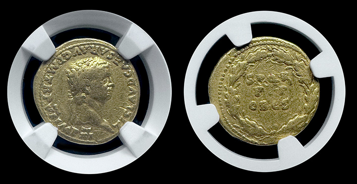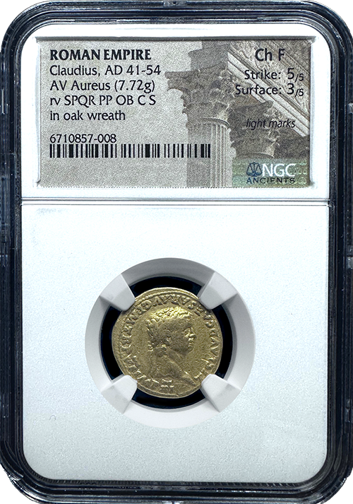 This gold aureus was struck during the reign of Claudius, the fourth emperor of Rome. Rising to power unexpectedly after the assassination of Caligula, Claudius overcame doubts about his suitability to rule and proved to be an effective and pragmatic leader. His reign is remembered for ambitious infrastructure projects, judicial reforms, and Rome’s expansion into Britain.