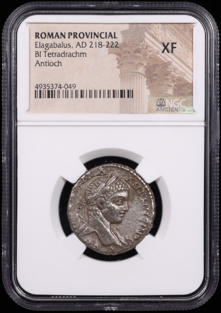 This impressive silver tetradrachm, struck during the brief yet eventful reign of Emperor Elagabalus, offers a fascinating glimpse into the political and cultural dynamics of the Roman Empire in the early 3rd century AD. Minted in the prominent city of Antioch, this coin reflects both Roman authority and local traditions, making it a prized artifact for collectors of ancient coinage.