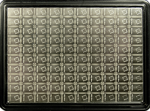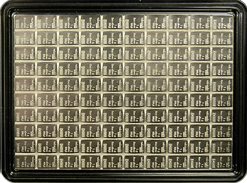 Custom made for potential barter, this product offers the very small size needed and solves the problem of potentially losing such small bars by connecting 100 individual one gram bars into one larger piece and packaging it in a resealable case complete with Valcambi certification.