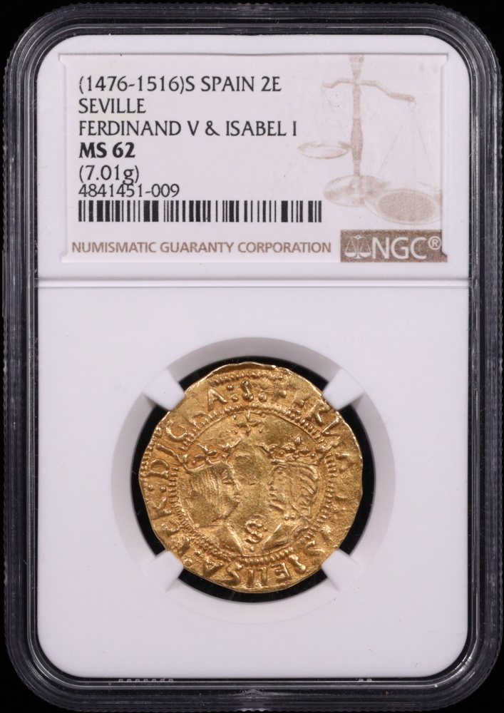 The 1476-1516 Spain 2 Escudo from the Seville Mint, struck during the reign of Ferdinand V and Isabella I, is a stunning gold coin from one of the most pivotal periods in Spanish history. Certified Mint State-62 by NGC, this piece offers a remarkable glimpse into the wealth, power, and legacy of Spain’s most influential monarchs.