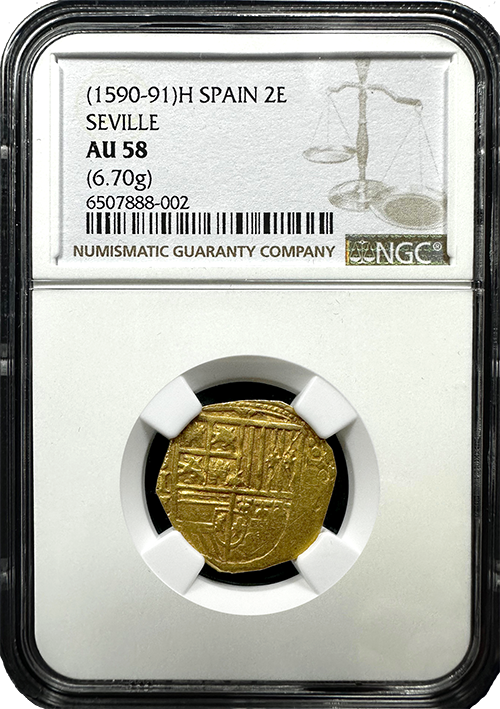 In conclusion, this 1590-91 Spanish Gold Cob 2 Escudo is a piece of Spanish history and a rare and highly coveted collector’s item. Its About Uncirculated-58 condition, certified by NGC, and its distinction as the only certified coin this year make it an irreplaceable addition to any collection.