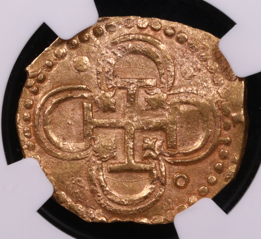 On the reverse, a sharply defined Christian cross stands prominently, symbolizing Spain’s deep-rooted ties to the Catholic Church and its role as a defender of the faith. The cross’s deep lines contrast against the rough edges typical of cob coinage, making it one of the more striking features of the piece. Despite the crude production process of the time, the design's craftsmanship highlights its importance both artistically and historically. The cross is a powerful reminder of Spain’s religious and imperial ambitions.