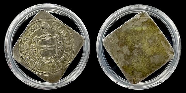 The obverse features a central emblem, likely symbolizing the authority or territorial power of Münster. Surrounding the emblem, inscriptions form a circular legend within the square design, reading “Monast Westph Obsessvm 1660” ("Münster, Westphalia Besieged 1660"). This inscription likely commemorates a significant historical event involving Münster’s political or military history.