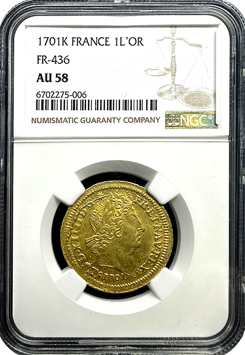 Graded at AU 58, this coin offers a unique window into the past. With sharp details and well-preserved surfaces, it's an exceptional addition to any collection. The 1701 K France 1 L'Or is more than just a coin; it's a portal to the early 18th century, an age of kings and a burgeoning European culture.