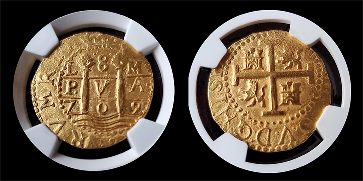 This stunning, mint condition gold Escudo was struck in Colonial Peru in 1709 and sunk to the bottom of the ocean in 1715 where it laid undisturbed for nearly 300 years. Rarely do you encounter shipwreck "Cob" gold such as this in such a high state of preservation. The detail and strike are extraordinary and this is an absolute historic treasure in all regards. Phenomenal opportunity and Peruvian gold escudos are known around the world for their high quality craftsmanship.