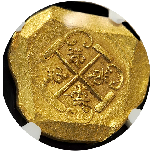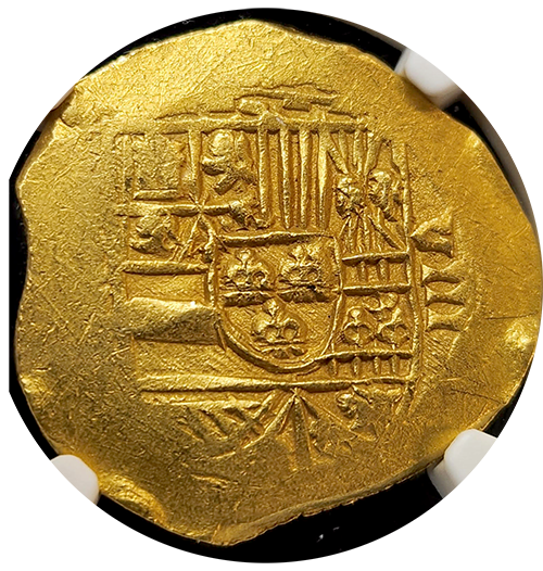 The reverse of this 1712 Gold Cob 8 Escudo features a prominent cross, a symbol deeply rooted in Spanish colonial coinage. The well-defined cross, framed by additional design elements, enhances the coin’s historical and cultural significance. This detailed and well-preserved reverse design adds to the coin’s visual appeal and historical value, underscoring its status as a near-gem piece.