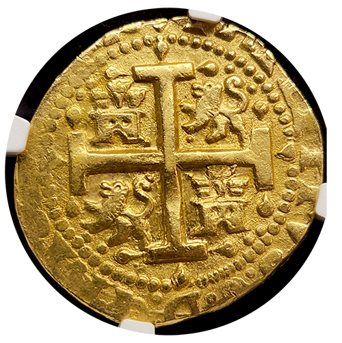 Reverse: The reverse features a bold, intricately detailed Jerusalem Cross, a classic design seen on Spanish gold escudos. The cross is quartered by ornate castles and lions, representing the kingdoms of Castile and León—the foundation of Spain’s monarchy. This striking imagery is surrounded by a beaded border, enhancing the regal and historic appeal of this early 18th-century gold treasure.