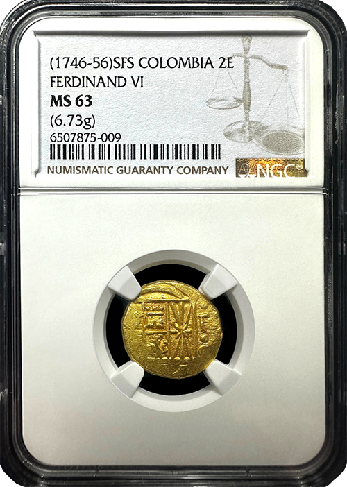The 1746-56 Colombia Gold Cob 2 Escudo of Ferdinand VI, certified by NGC in Mint State 63, stands out as an exceptional example of colonial coinage. This coin is among the finest known examples, boasting completely evident and well-centered design details that reflect the superior craftsmanship of the era.
