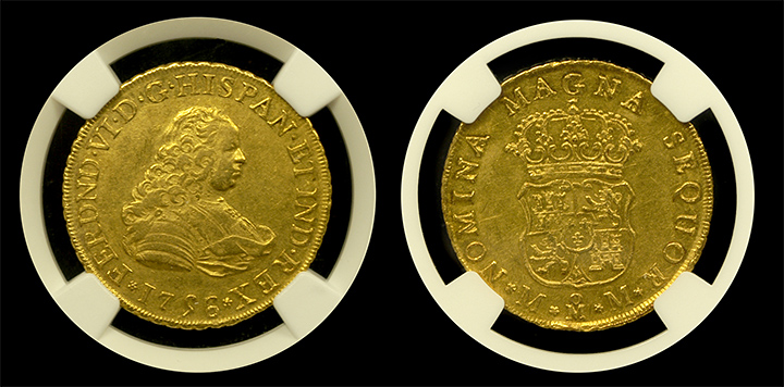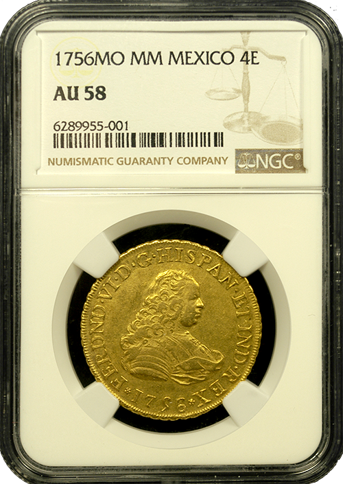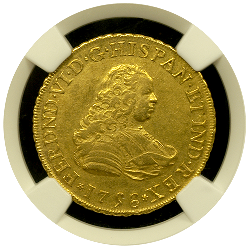 Struck in Mexico City in 1756, this stunning gold 4 escudo is the outright finest example known in the world today. Looking at population reports, this is one of only six total certified in all grades, evidence of its overall scarcity. An amazing coin destined for a fine collection. Coin shown is the exact coin you will receive.
