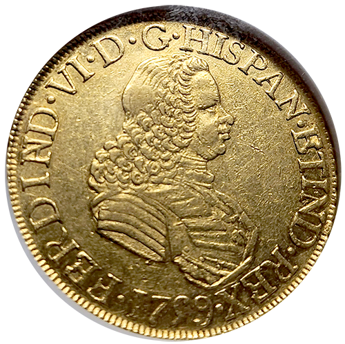 This extraordinary 1759 Mexican Gold 8 Escudo is a superb example of early colonial coinage from the Spanish Empire, certified by NGC in About Uncirculated-50. Struck during the reign of King Ferdinand VI, this gold coin symbolizes the immense wealth flowing from the Spanish colonies in the New World back to Europe. These coins were among the highest denominations in circulation, often used for significant transactions between colonial powers and aristocracy.