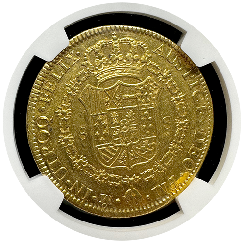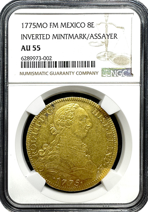 Step back in time to the colonial era of Mexico with the 1775-MO (FM) Mexico 8 Escudo coin, now available at Austin Rare Coins. Graded by NGC as AU-55, this remarkable coin offers a glimpse into Mexico's historical narrative, featuring an inverted mintmark/assayer and intricate design details.