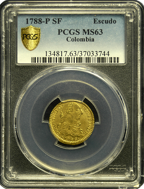 Graded by PCGS in mint state 63, this Colombian gold 1 Escudo is one of the finest known in the world today. Great detail and overall strike can be found on both sides of this coin. Highly recommended.