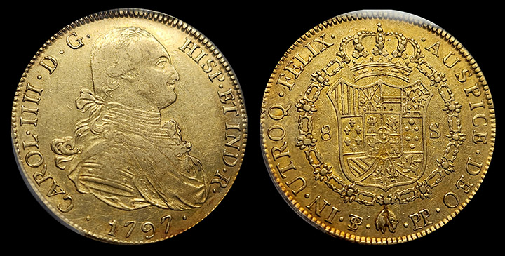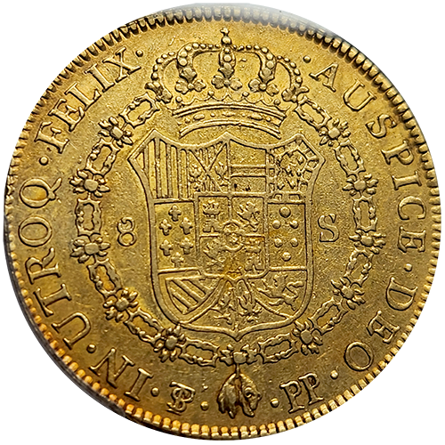 The PTS mintmark and PP assayer initials confirm its origin in Potosí, one of the most prolific and important mints in Spanish South America. Struck in .875 fine gold, the 8 Escudo was the highest denomination of gold coinage in circulation at the time and a direct representation of royal authority and economic dominance in the New World.