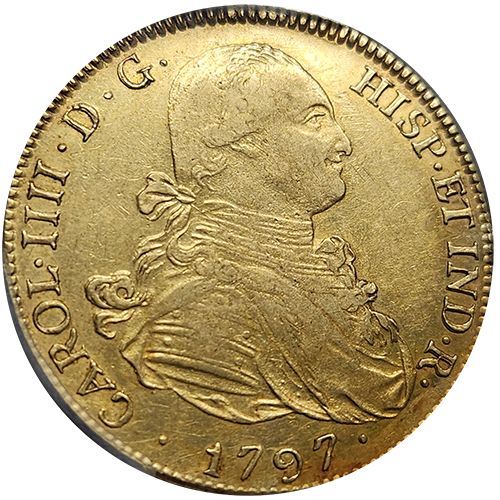 CAROL·IIII·D·G on the left and HISP·ET IND·R on the right—short for Carolus IIII Dei Gratia, Hispaniarum et Indiarum Rex, or “Charles IV, by the Grace of God, King of the Spains and the Indies.” The date 1797 appears clearly beneath the portrait.