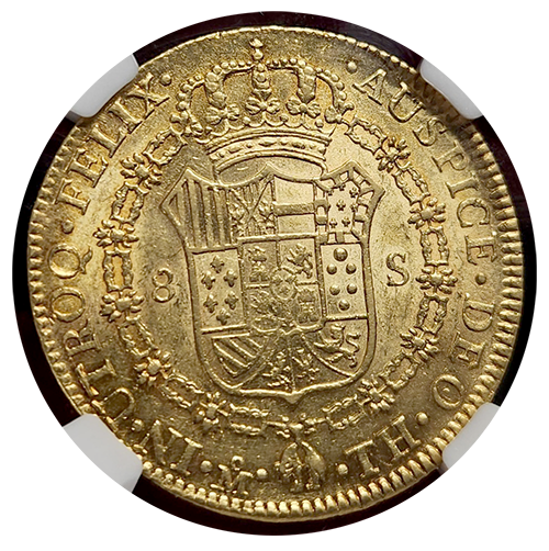 The reverse showcases the Spanish coat of arms, symbolizing the vast expanse of the Spanish Empire. Flanking the shield are the denomination markers "8" and "S," indicating the coin’s value of 8 Escudos. The surrounding Latin inscriptions read “IN.UTROQ.FELIX” on the left and “AUSPICE.DFO.TH” on the right. These inscriptions, which translate to “Happy under both (worlds)” and “Under the auspices of God,” reflect the coin’s historical and cultural significance. The intricate details of the shield, combined with these Latin inscriptions, make this coin a highly prized piece.