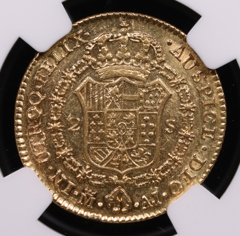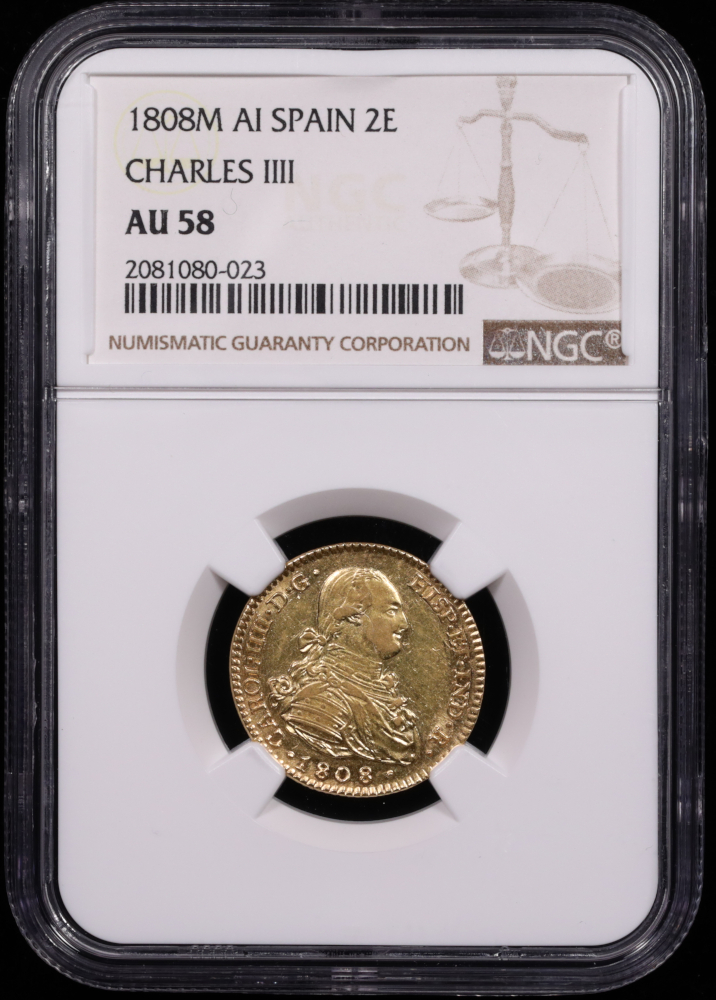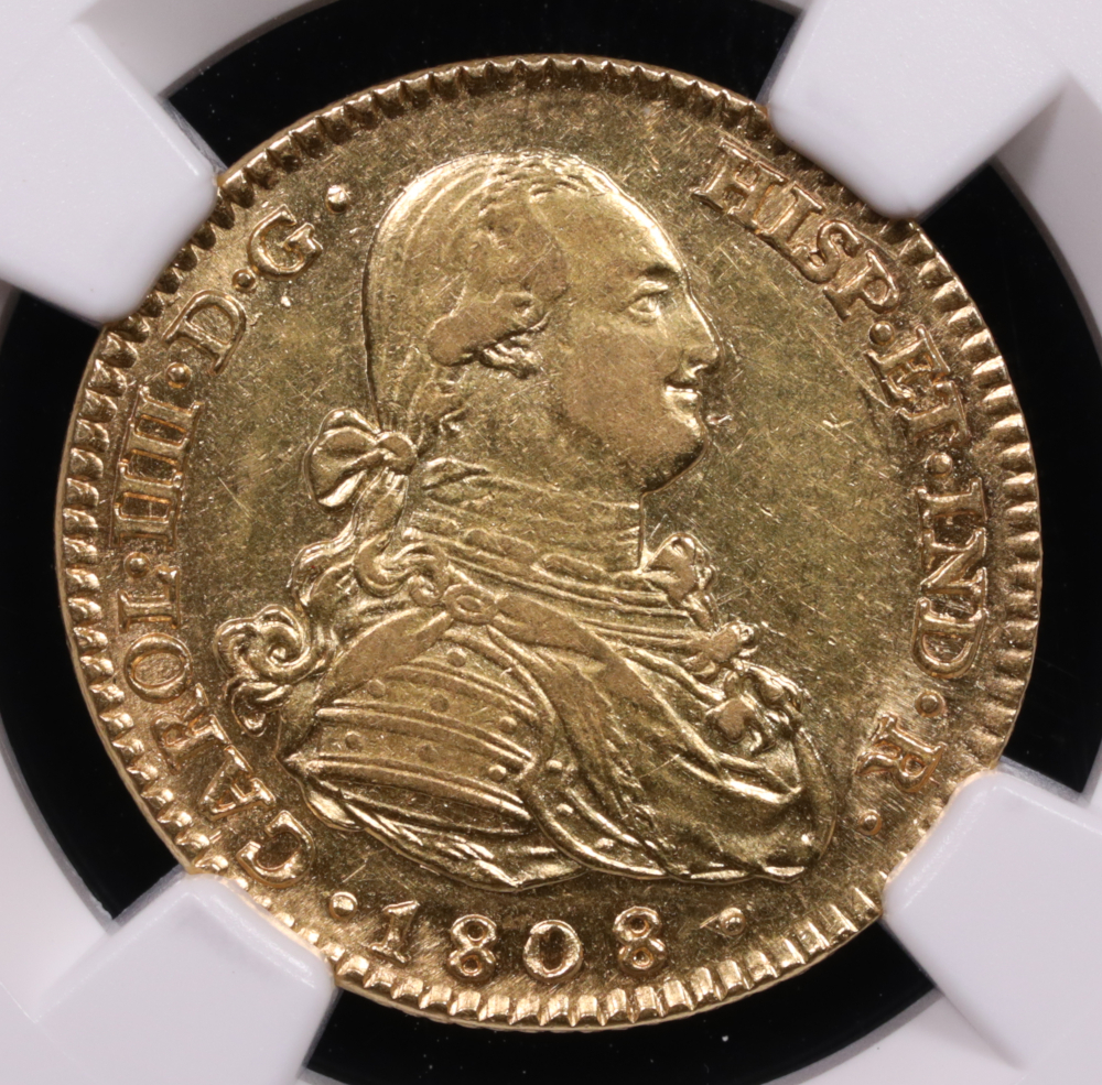 This 1808-M 2 Escudos was struck at the Madrid mint during the final year of Charles III's coinage designs, as Spain stood on the brink of the Peninsular War and Napoleonic occupation. Though Charles III died in 1788, his portrait continued to appear on Spanish gold coinage through 1808 under his successor Charles IV, making these later-dated issues particularly interesting transitional pieces. The 2 Escudos denomination served as a workhorse gold coin in Spanish commerce and colonial trade, and examples from the Madrid mint are prized for their consistent quality and historical significance.