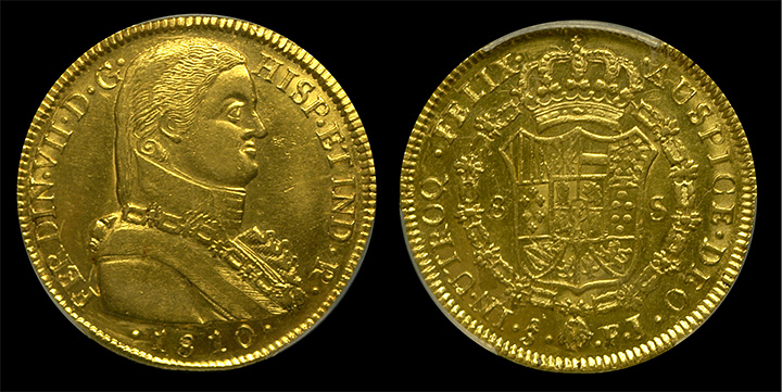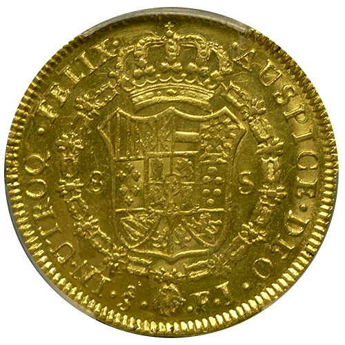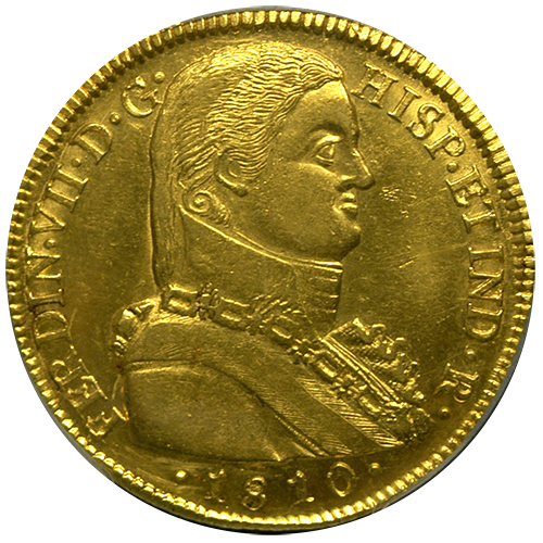 Issued in Chile over 200 years ago, this is truly a stunning gold 8 escudo in all regards. From the lustrous and bright yellow-gold surfaces to the amazing strike on both sides, the detail appears to be far better than an AU-58 would imply. The date ‘1810 ‘ is hand-cut at the bottom and the image of Ferdinand VII is shown in lifelike detail on the front.