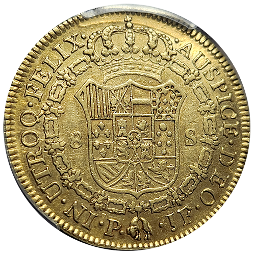 Struck in .875 fine gold, this coin carries the “P” mintmark and “JF” assayer initials, linking it directly to the Bogotá Mint. Notably, this was among the final issues of the Spanish crown in New Granada, minted in the same year Colombia began its push for sovereignty—giving this piece added historical weight.