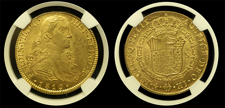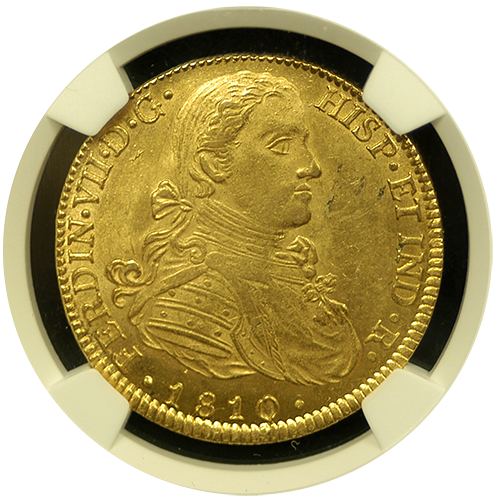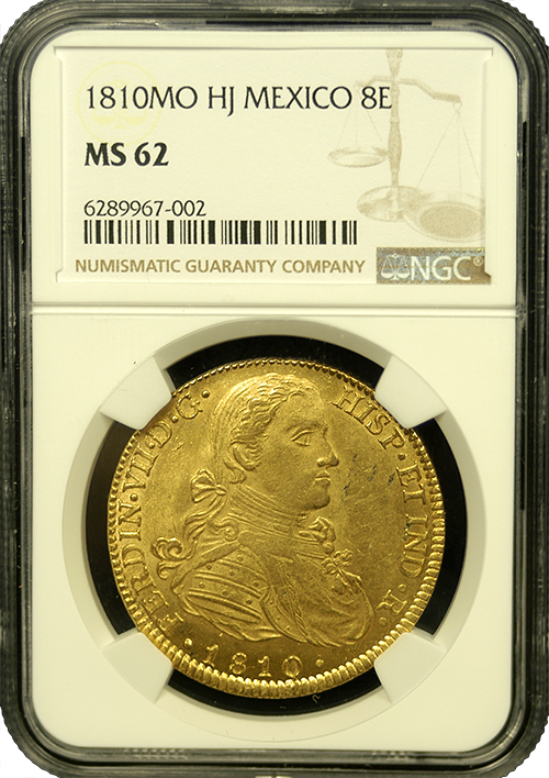 What a great coin for the price! This stunning Mexico gold 8 Escudo was struck in 1810 and has been certified by NGC in a mint state 62 condition. Gleaming with original mint luster, this is one of the top 10 known from must 51 certified in all. Furthermore it has over $1400 worth of gold alone!