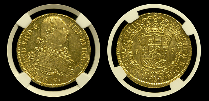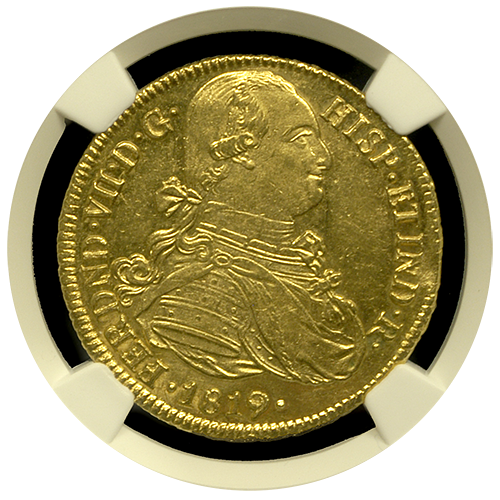 If you are looking for a high-grade, top 5 example from Colonial Spain, check out this Mint State 63 1819 Colombia 8 Escudo. Around 30 are known in all grades combined and this is one of 3 in the grade with just 1 finer. Excellent strike and luster on both sides of this well-struck specimen. Coin shown is the exact coin you will receive.