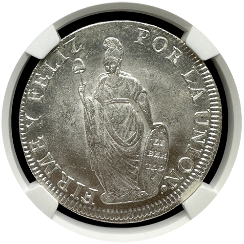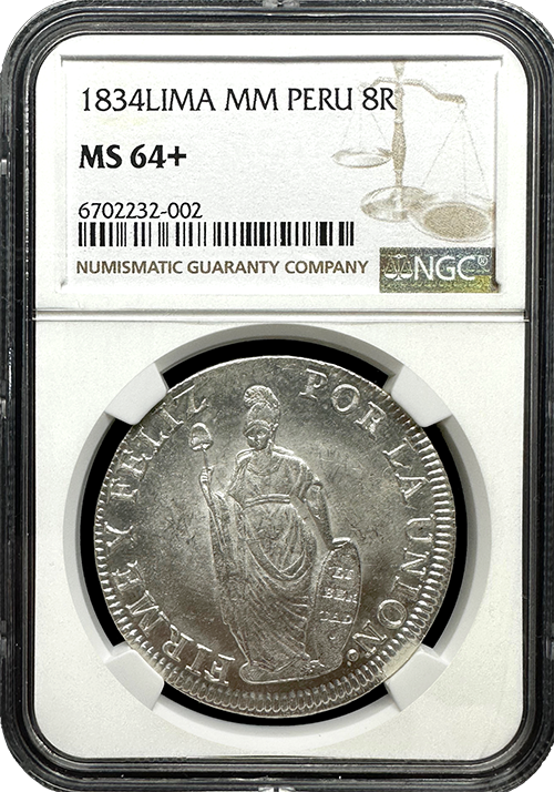 Explore the captivating history of the 1834 Lima MM 8 Reales from Peru, a numismatic treasure certified by NGC in Mint State-64 Plus condition. This silver coin, containing .7859 oz of silver, was struck in Lima, Peru, making it a poignant piece of South American history.