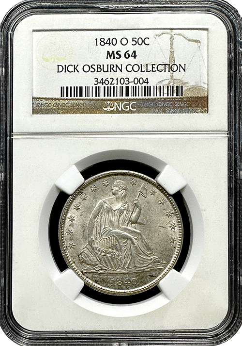This remarkable 1840 New Orleans Mint Liberty Seated Half Dollar, with the sought-after Small O variety, stands as a numismatic treasure of exceptional rarity. Graded by NGC as Mint State 64, this coin originates from the esteemed Osburn Collection, showcasing both its quality and provenance.