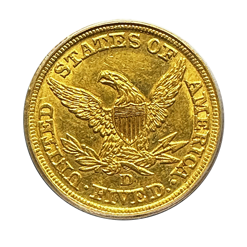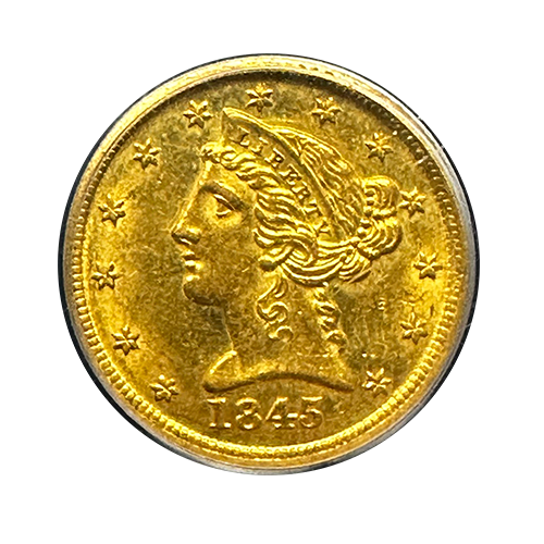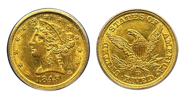Introducing the 1845-D $5 Liberty Gold Coin, a remarkable piece of American numismatic history. Minted at the Dahlonega Mint in Georgia, the "D" on the coin stands for "Dahlonega." This coin, certified by PCGS in Mint State 61, is available for purchase at Austin Rare Coins & Bullion.