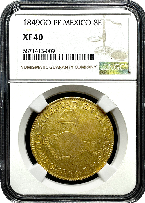 This 1849 Mexico 8 Escudo "Open Book" gold coin, minted in Guanajuato and certified by NGC in Extremely Fine 40 condition, is a coveted and historically significant Mexican coinage. Often referred to as the "Open Book" Escudo, this coin embodies the values of justice and freedom that defined 19th-century Mexico.