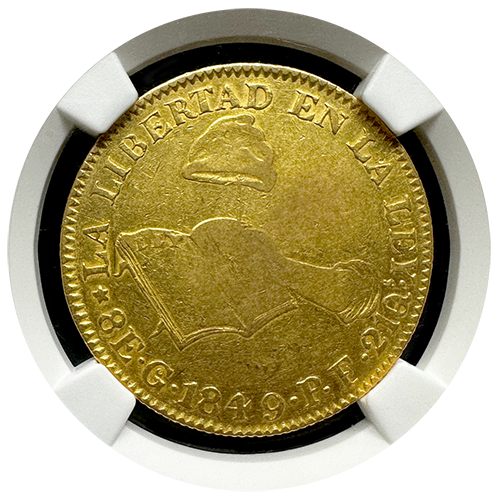 Obverse: The obverse features the iconic open book with scales of justice delicately balanced above, representing knowledge and equity. The inscription at the top reads "La Libertad En La Ley" (Freedom in the Law), reflecting the nation’s ideals. Beneath the open book is the denomination and mint information, reading "8E. G. 1849. P.F.," indicating the coin’s 8 Escudo value, gold content, year of mintage, and mint mark.