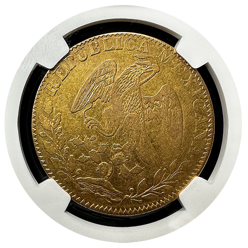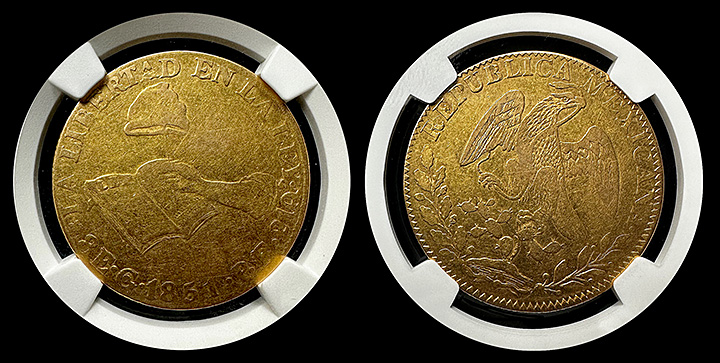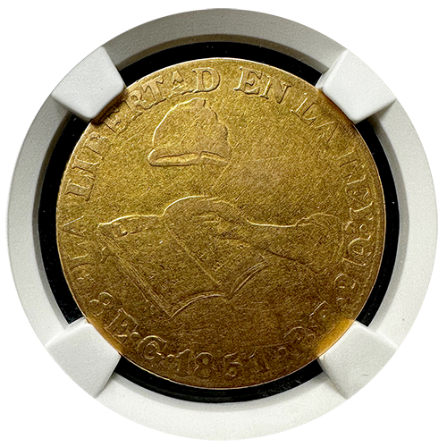 The 1851 Guanajuato, Mexico 8 Escudo is a splendid example of Mexican numismatic artistry and historical significance. This particular coin, certified by NGC in Very Fine 35 condition, stands as a testament to the rich history and economic influence of 19th-century Mexico.