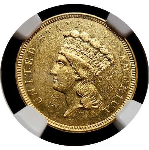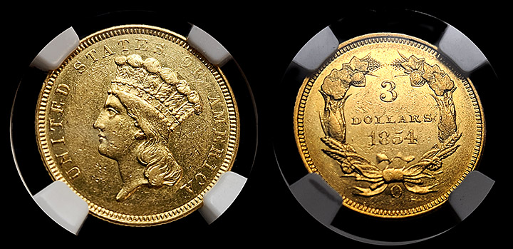 The 1854-O $3 Gold Princess Coin is a captivating and rare piece of American numismatic history. Certified by NGC in About Uncirculated 55 (AU-55) condition, this coin is the first and only $3 gold coin issued at the New Orleans Mint, known for its unique "O" mintmark.